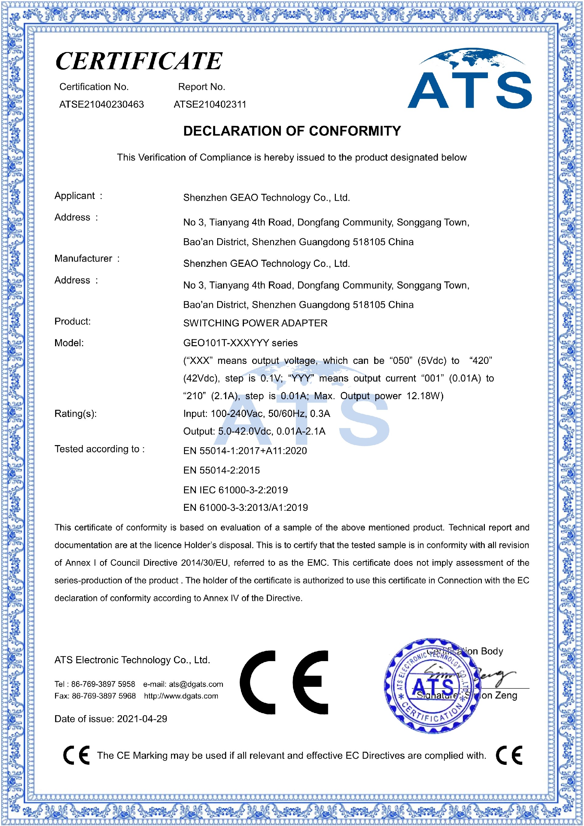 吉奧科技電源適配器CE證書(shū)
